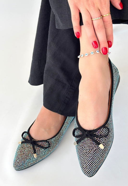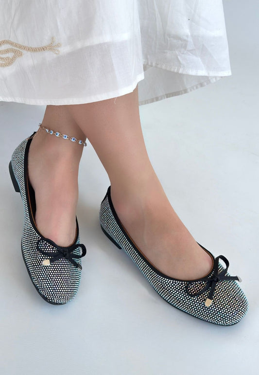 Hante Siyah Beyaz Keten Taşlı Babet Ayakkabı