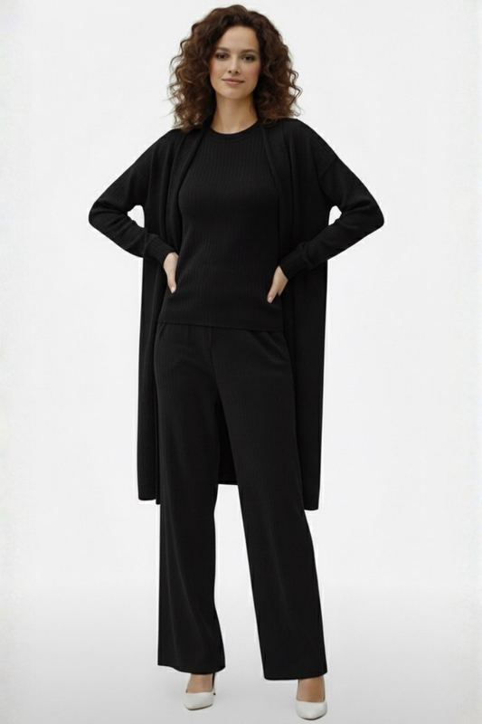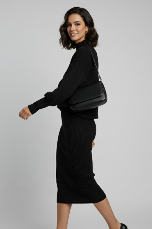 Triko Siyah Kazak ve Fitilli Elbise İkili Takım
